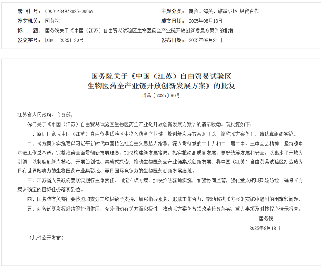 國務(wù)院批復(fù)同意《中國(江蘇)自由貿(mào)易試驗(yàn)區(qū)生物醫(yī)藥全產(chǎn)業(yè)鏈開放創(chuàng)新發(fā)展方案》